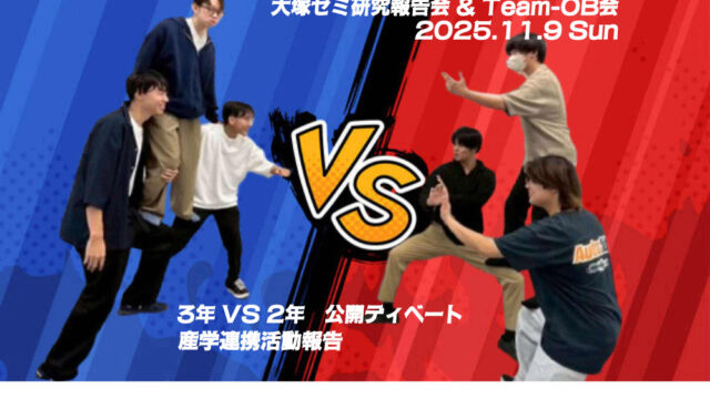 2025年11月9日(日)19時30分~、栄のFLOW Lounge にてTeam-OB会を行ないました!OB・OGの皆さまからは、ディベートのこと、ゼミ生活のこと、就活、社会人生活のこと・・様々なアドバイスをいただくことができました。まだ...